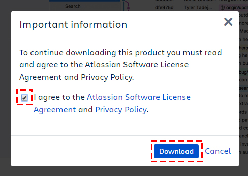 Atlassian 소프트웨어 라이센스 계약 및 개인 정보 보호 정책에 동의한다고 체크해주면 Download버튼이 활성화 됩니다.