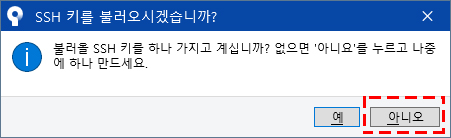 SSH 키를 불러오시겠습니까? 라는 Alert 메시지가 나오는데 저는 사용하는 부분이 없기 때문에 아니로를 클릭합니다.