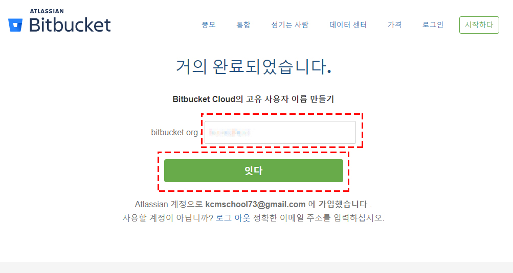 Bitbucket 에서 사용할 계정명을 입력 후 녹색버튼을 클릭!