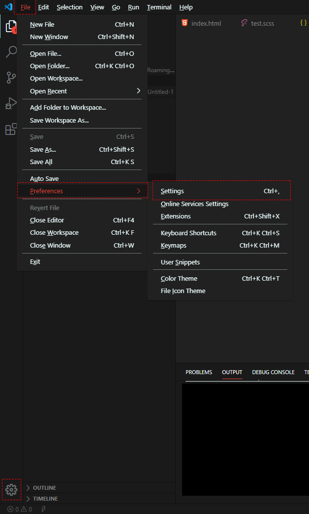 1. vscode를 실행. 그러면 하단 우측에 톱니바퀴 모양을 클릭하면 Settings 메뉴를 클릭합니다. 또는 File > Preferences > Settings를 클릭! 그럼 셋팅 화면을 확인할 수 있습니다.