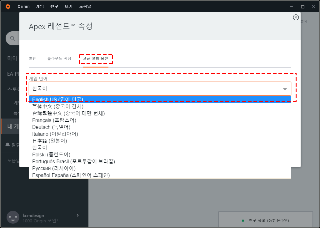아까와 같이 "고급 실행 옵션" 탭으로 가면 게임 언어 선택하는 란이 나옵니다.