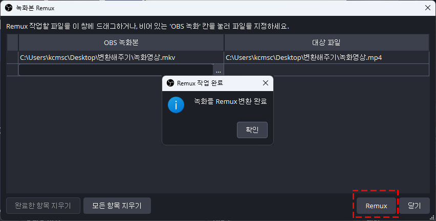 위와같은 화면이 나오고 Remux 버튼을 누르면 변환을 시작합니다.