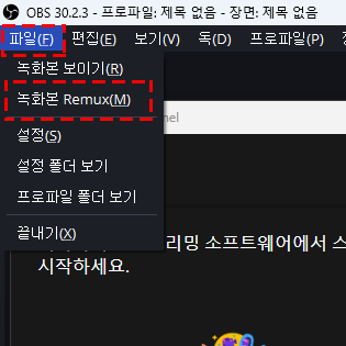 파일 > 녹화본 Remux 메뉴를 눌러줍니다.
