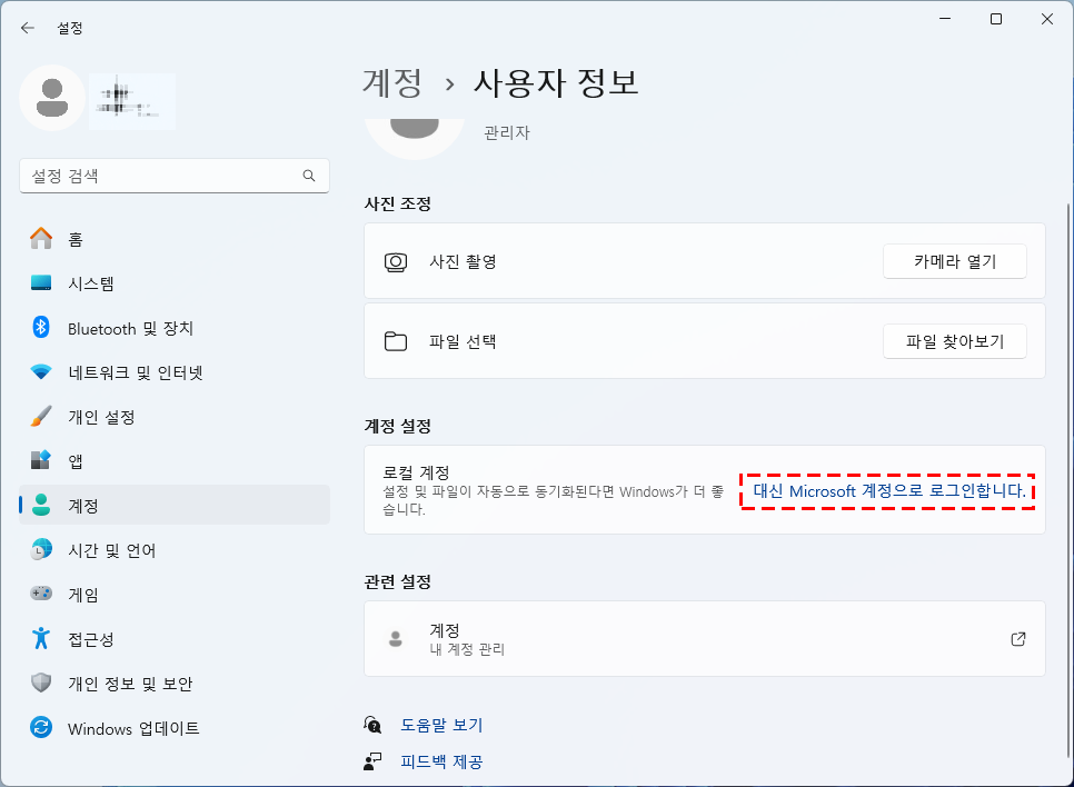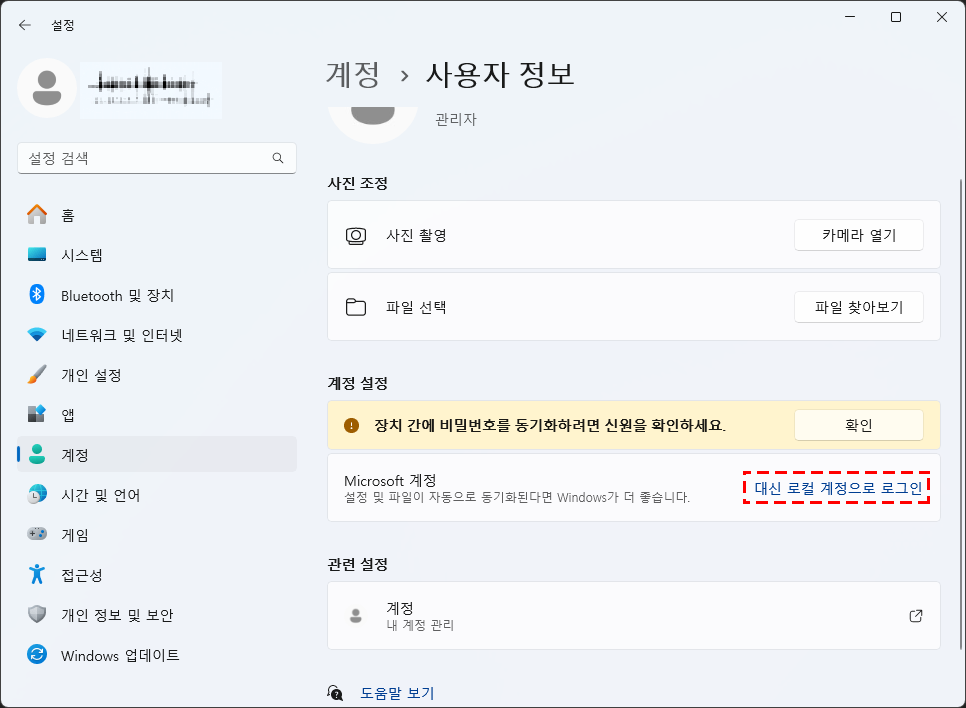 먼저, 현재 마이크로소프트 계정을 사용 중이라면 로컬 계정으로 전환해야 합니다.