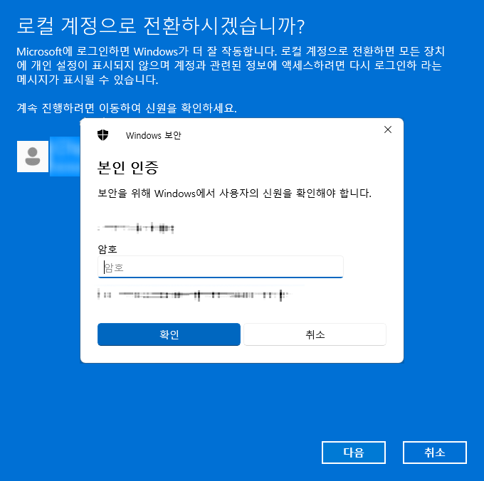 - 로컬 계정 사용 및 암호 제거는 보안상 위험할 수 있으므로 개인용 컴퓨터에서만 사용하세요.