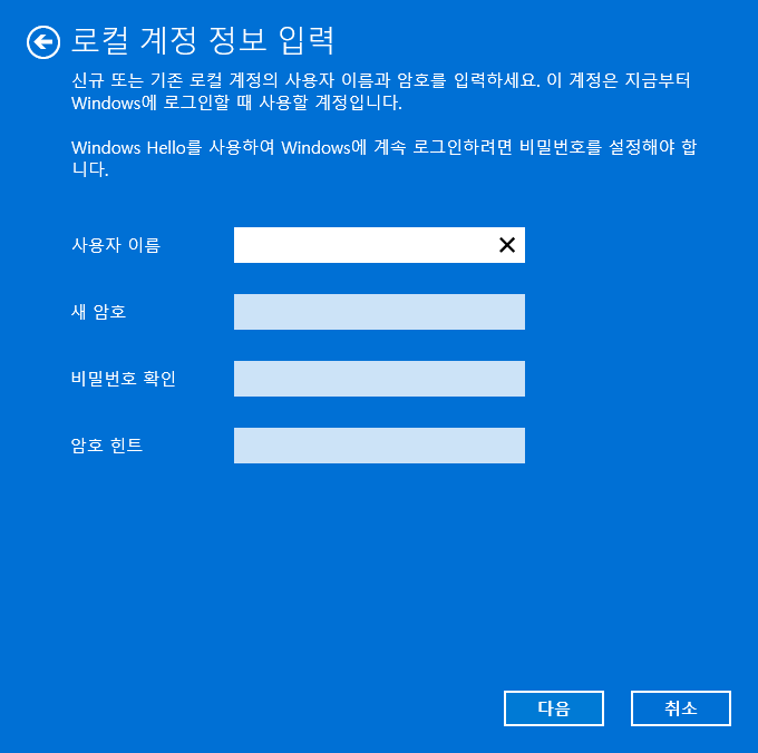 4. 새로운 로컬 계정 정보를 설정합니다.