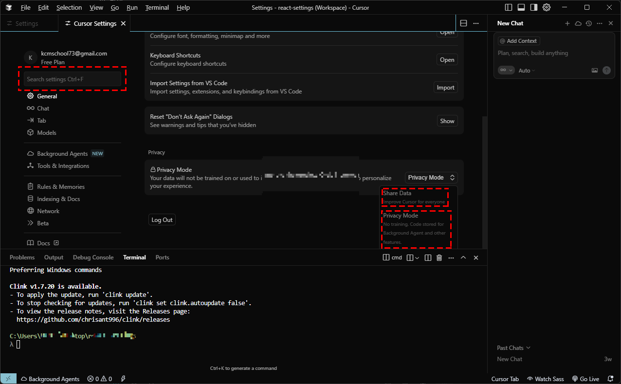 Cursor 에서 "코드학습" 기능 끄는 방법(설치 완료 후)
