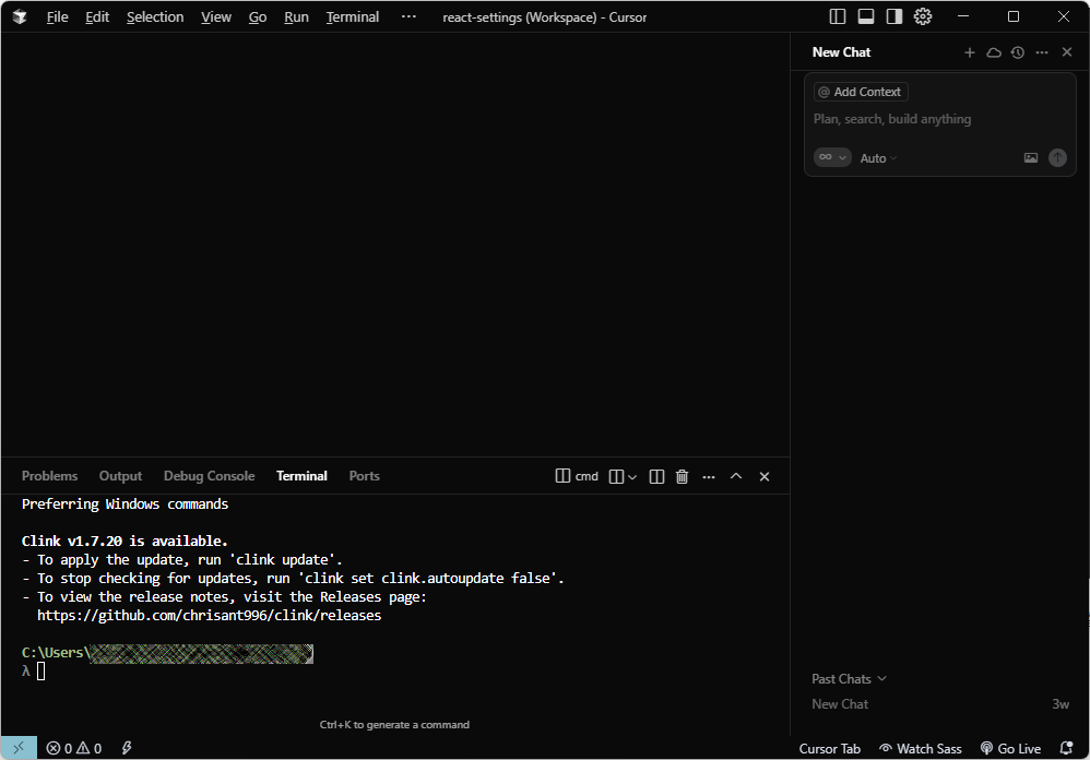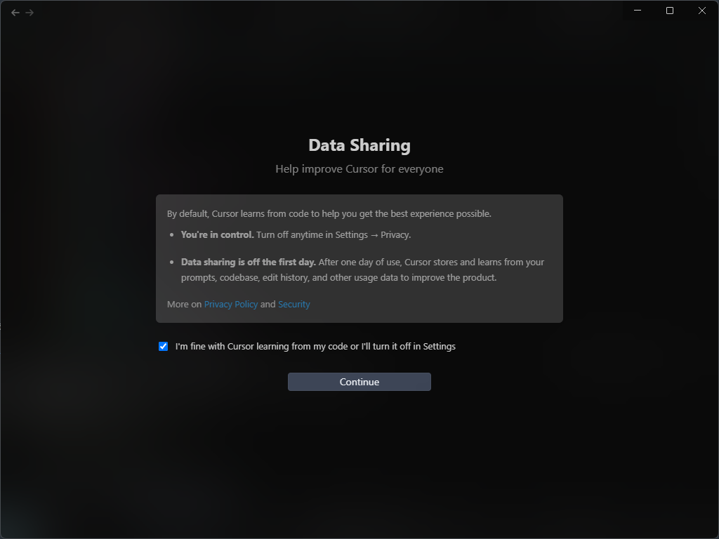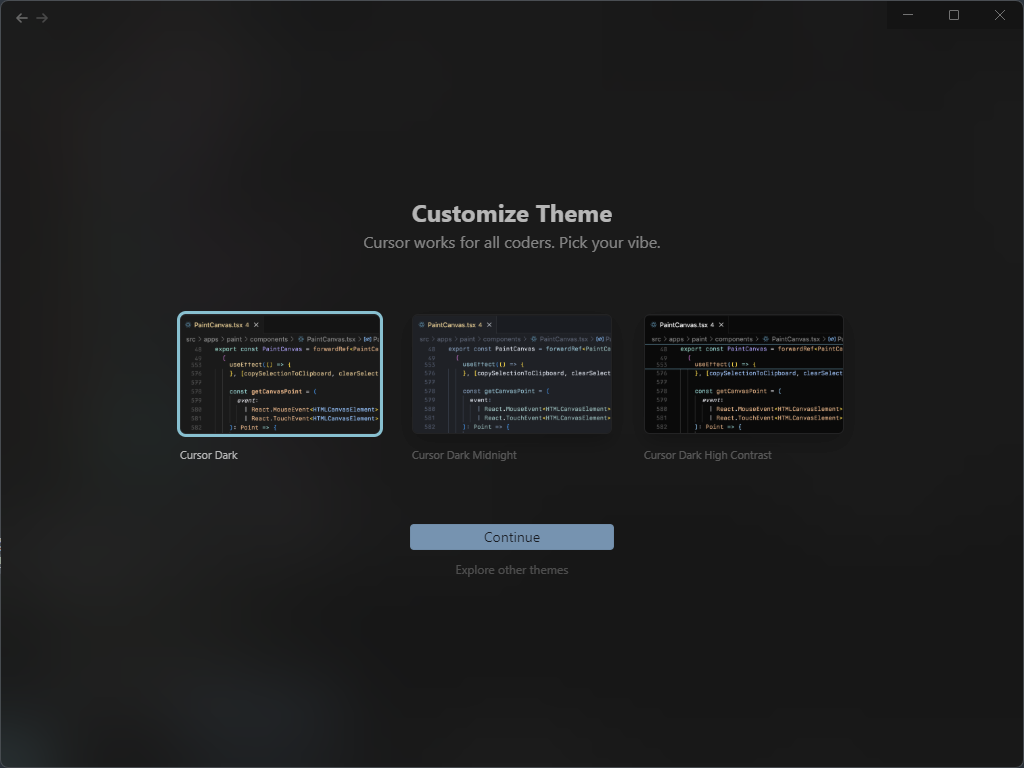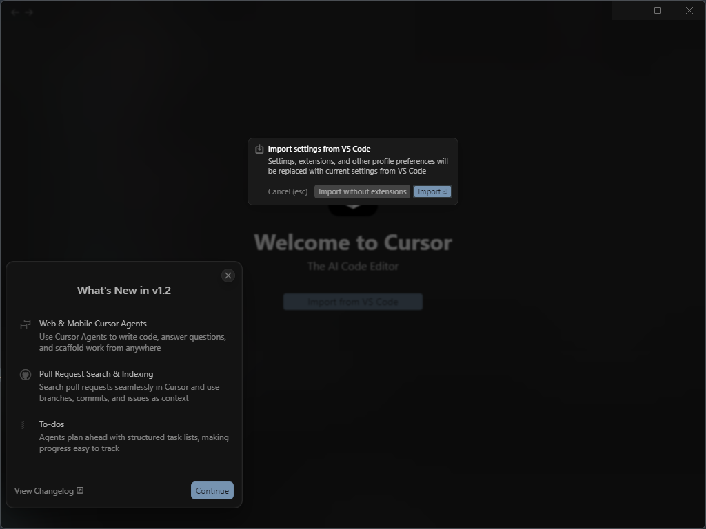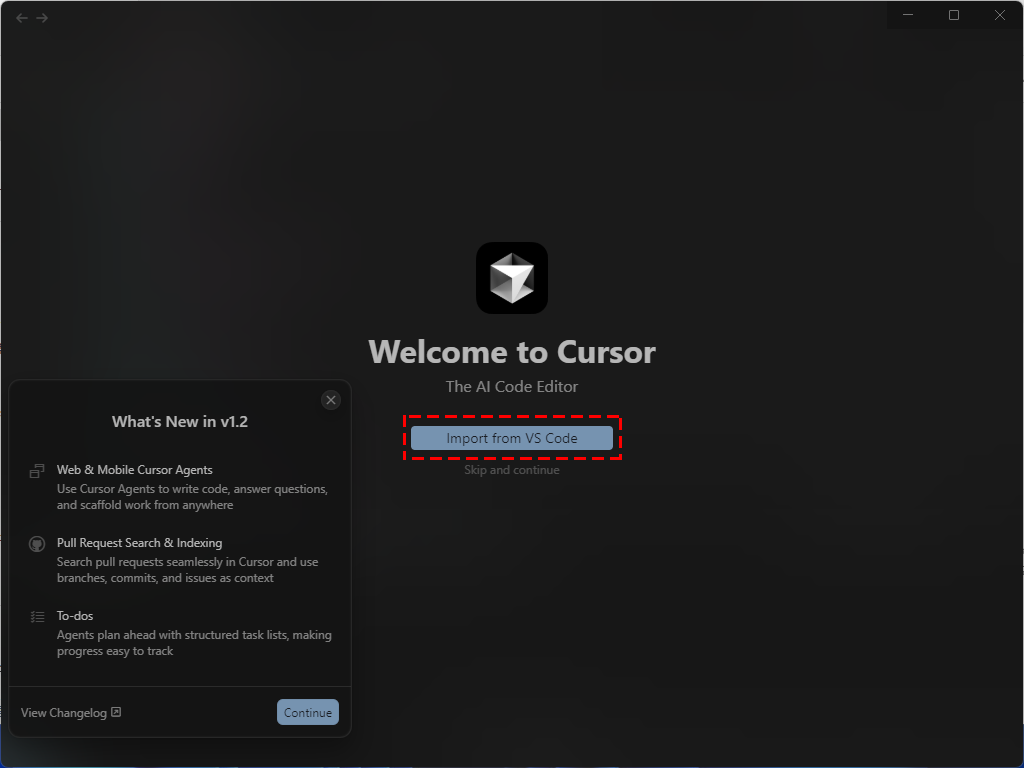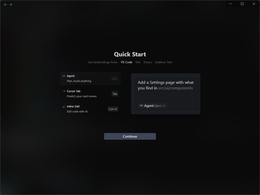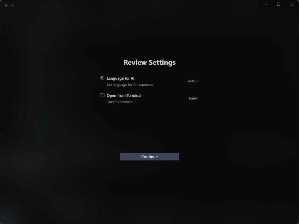 Review Settings 도 Continue 버튼을 눌러 다음으로 넘어가주면 cursor 화면을 확인하실 수 있습니다.