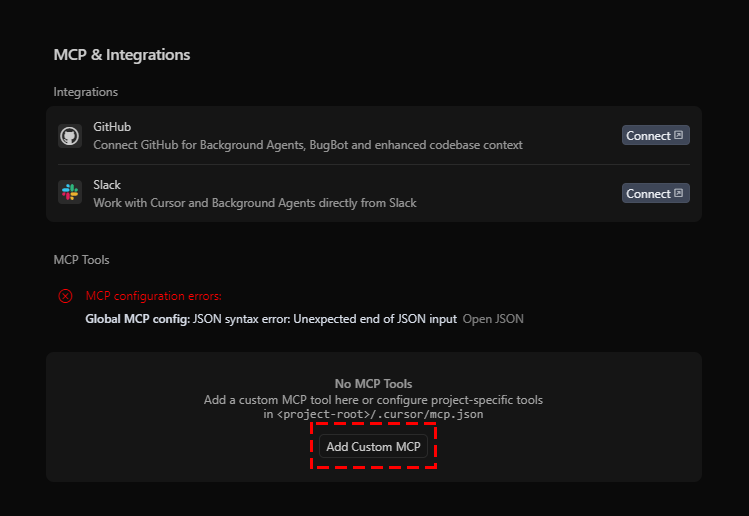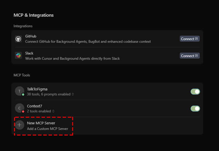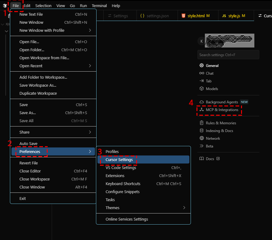 위 이미지에 나와 있는 순서로 들어가 커서 셋팅에서 MCP & Integrations 에 들어가 줍니다.